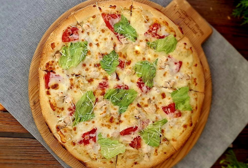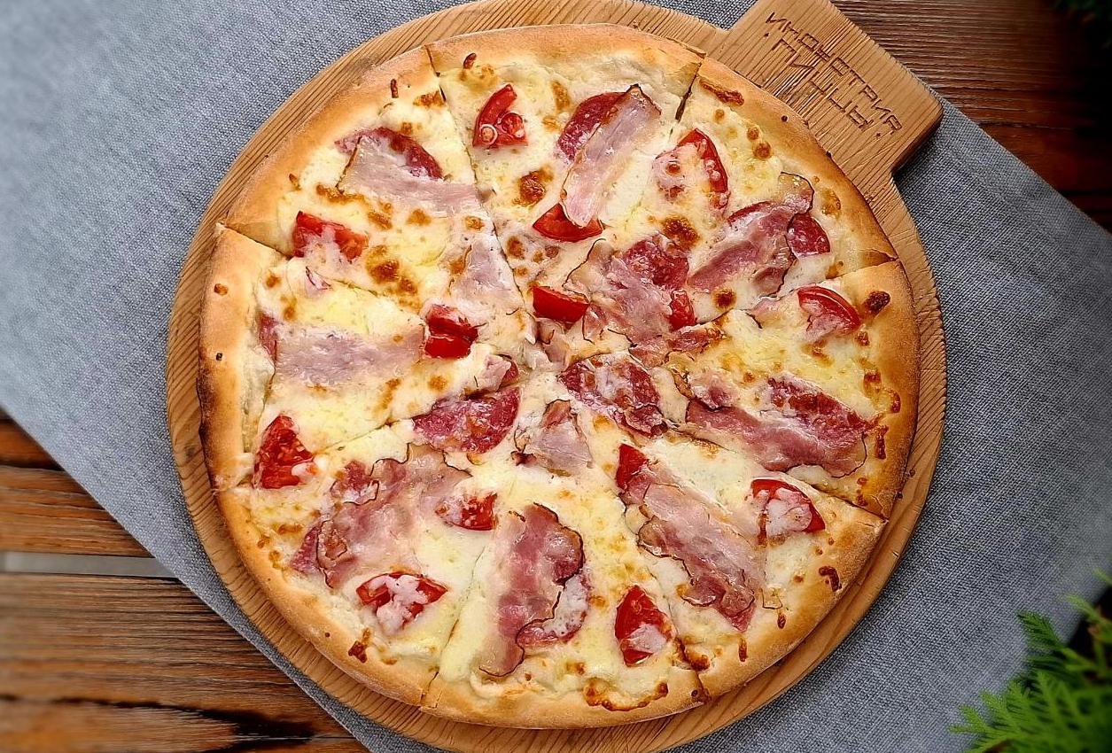 Состав: сливочный соус, копченая курочка, грибы, грудинка, моцарелла, томаты