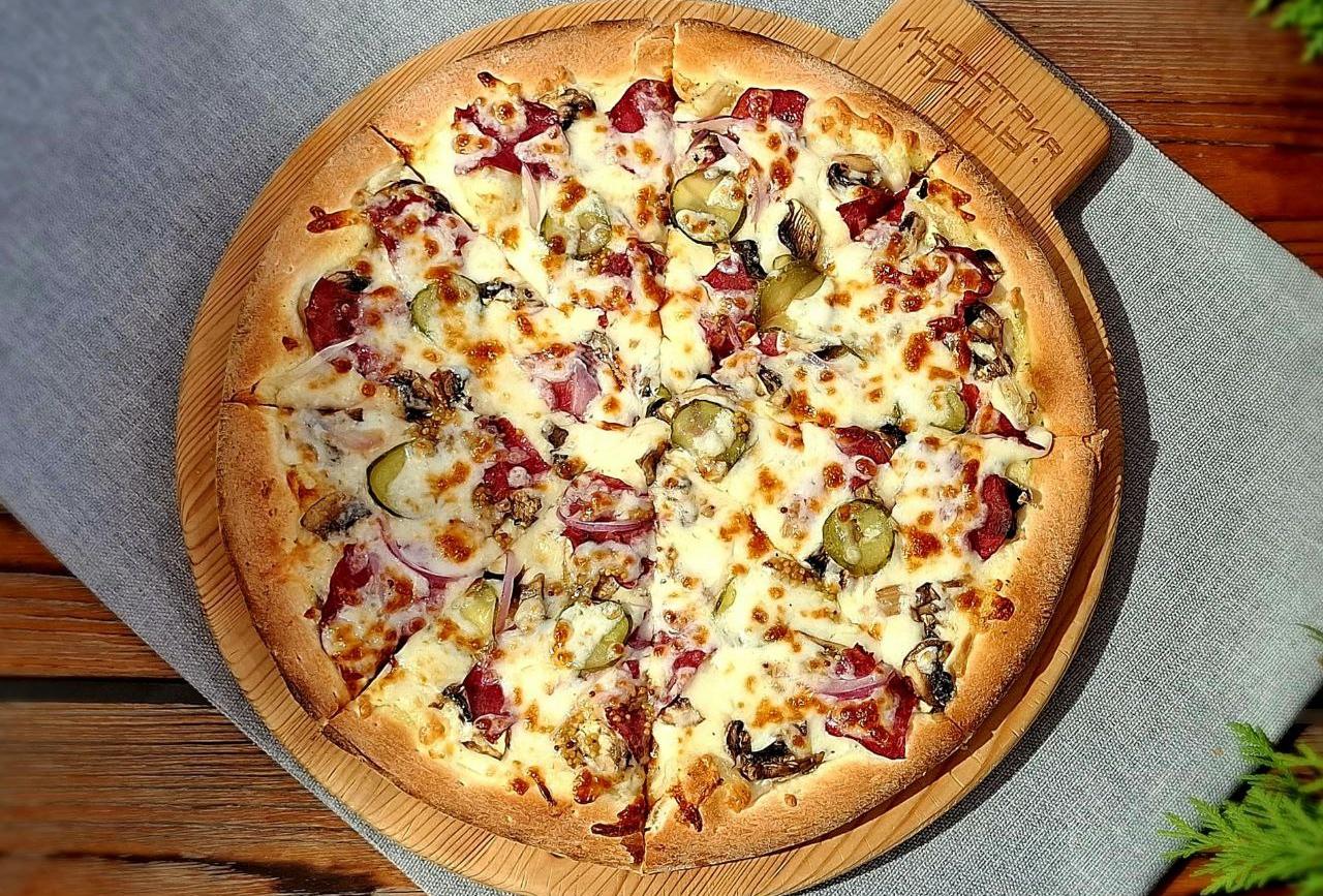 Состав: соус фирменный, моцарелла, сервелат, охотничьи колбаски, грибы, маринованные огурчики, перец халапеньо
