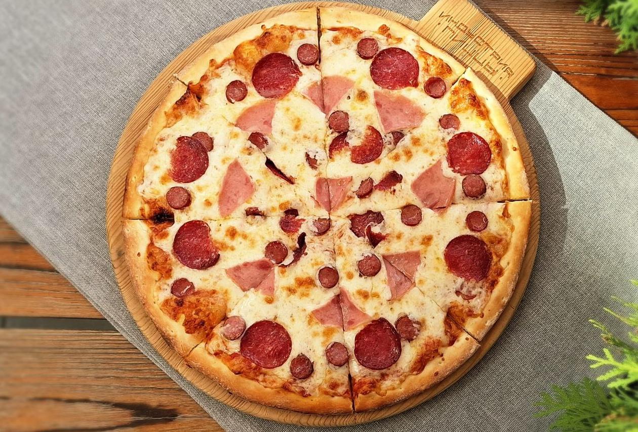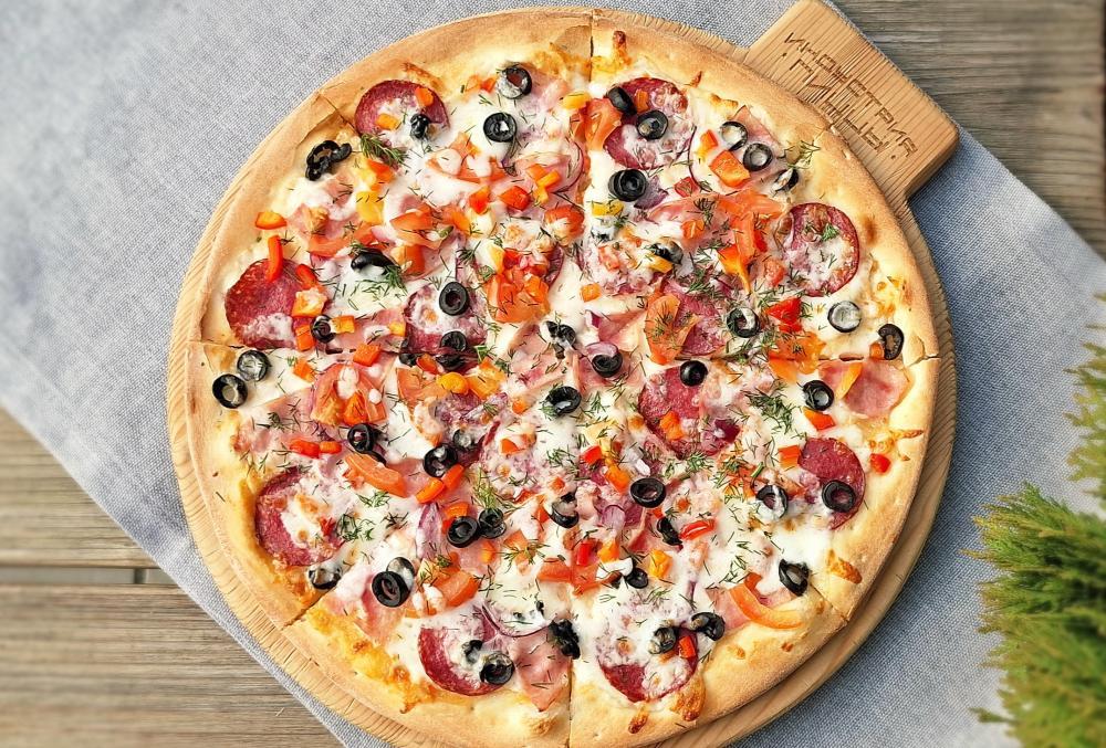 Состав: соус фирменный, моцарелла, салями, помидоры, ветчина, ялтинский лук, болгарский перец, укроп, маслины