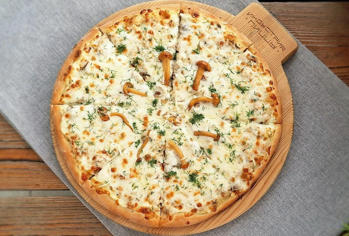 Состав: сливочно-чесночный соус, моцарелла, курочка, лук, шампиньоны, опята, сливки, пармезан, укроп