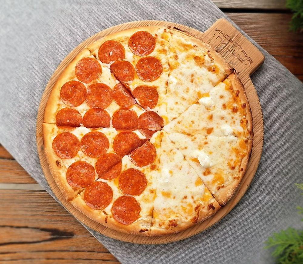 Сливочный соус, пепперони, моцарелла, сливочный сыр, чеддер, пармезан