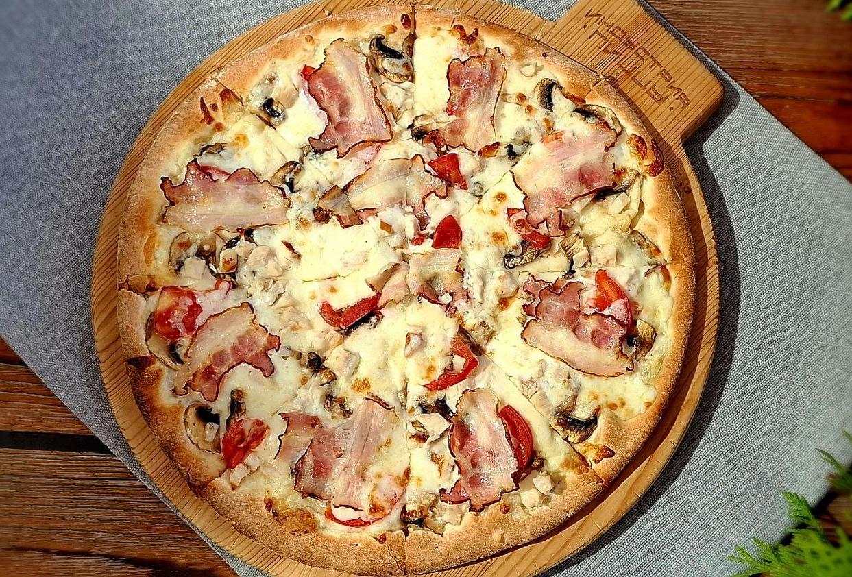 Состав: сливочный соус, копченая курочка, грибы, грудинка, моцарелла, томаты