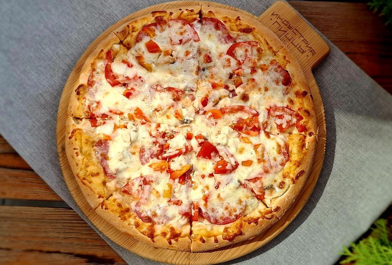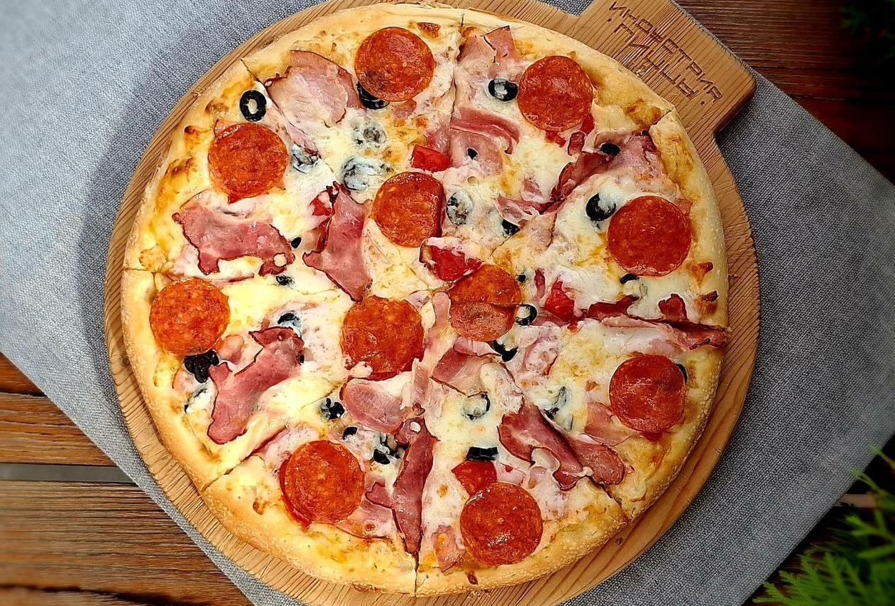 Состав: фирменный соус, моцарелла, пепперони, ветчина, грудинка, томаты, маслины