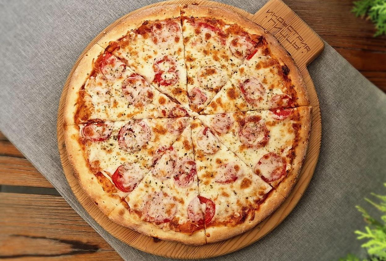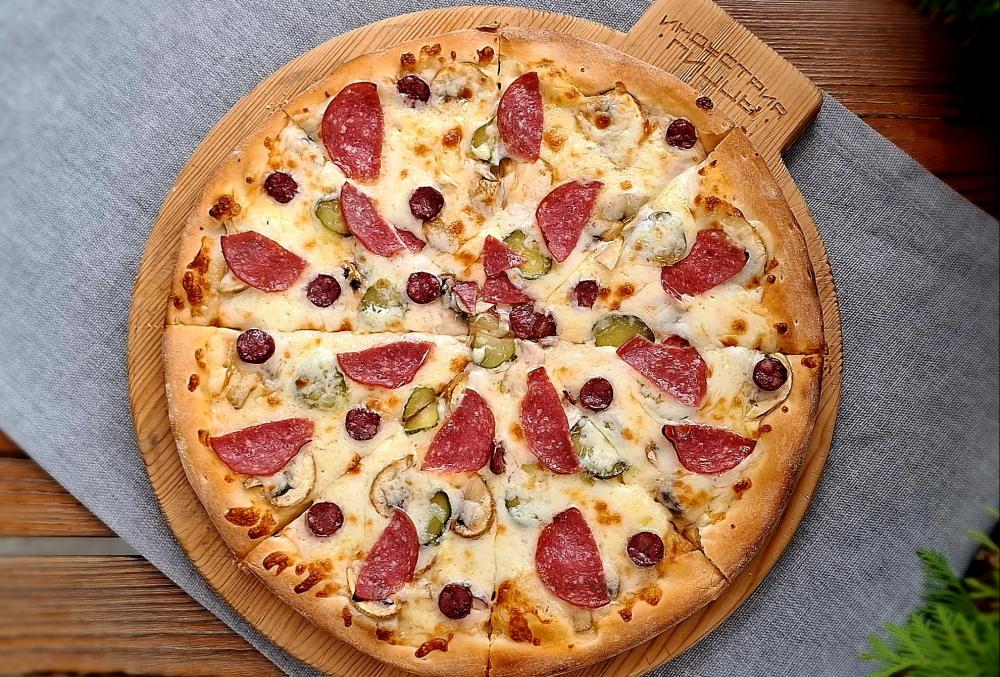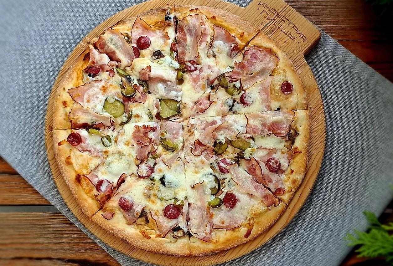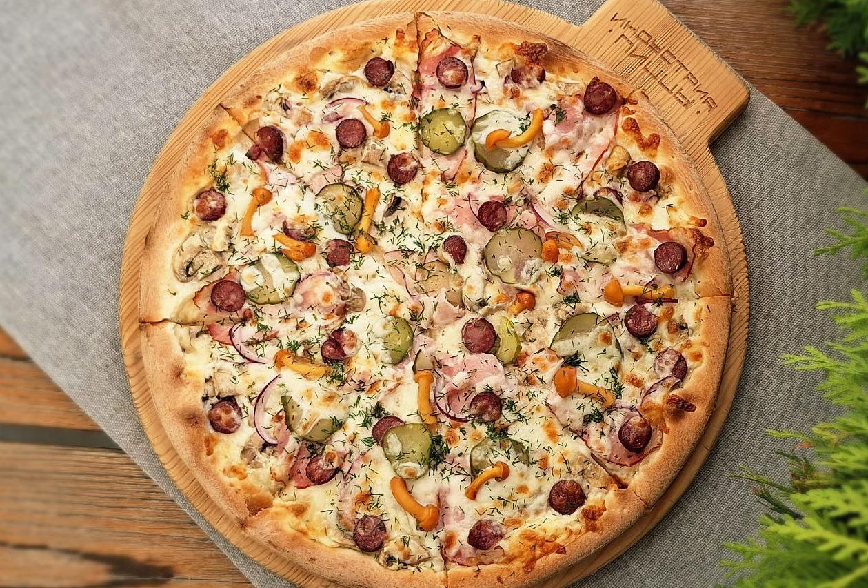 Состав: соус фирменный, моцарелла, сервелат, охотничьи колбаски, грибы, маринованные огурчики, перец халапеньо