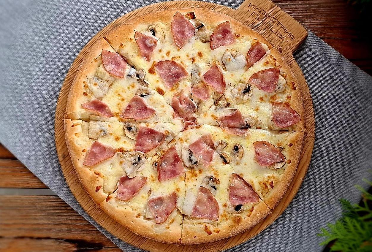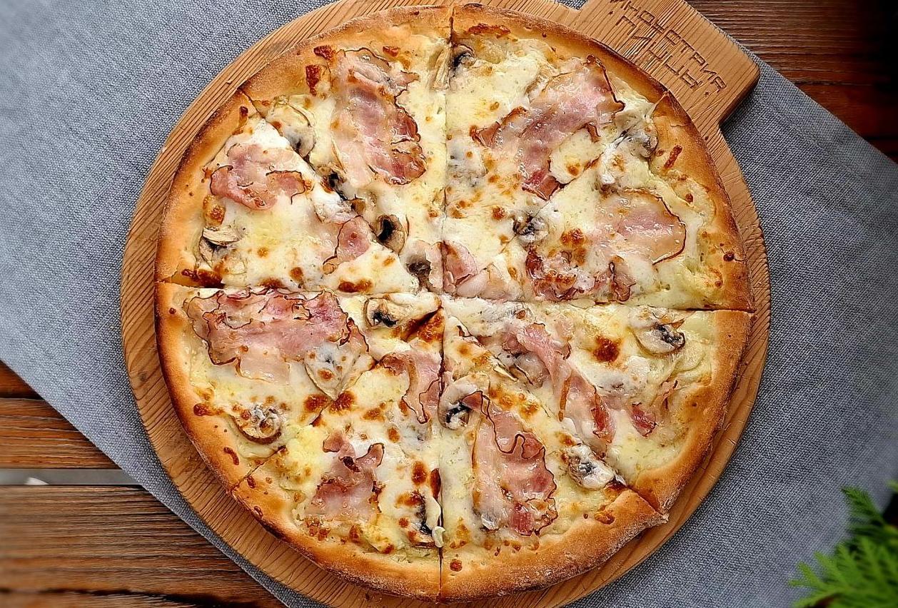 Состав: соус сливочно-чесночный, грудинка, грибы, сыр моцарелла, сыр пармезан