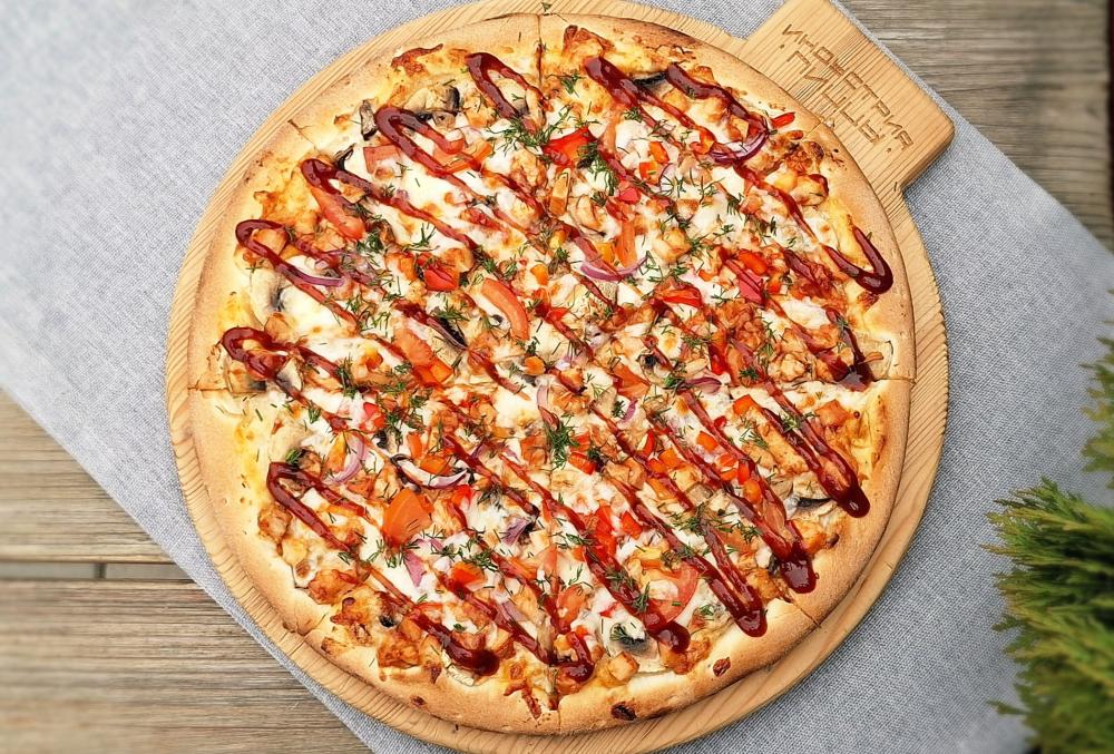 Состав: моцарелла, копченая курочка, помидоры, грибы шампиньоны, укроп, ялтинский лук, болгарский перец, соус барбекю.