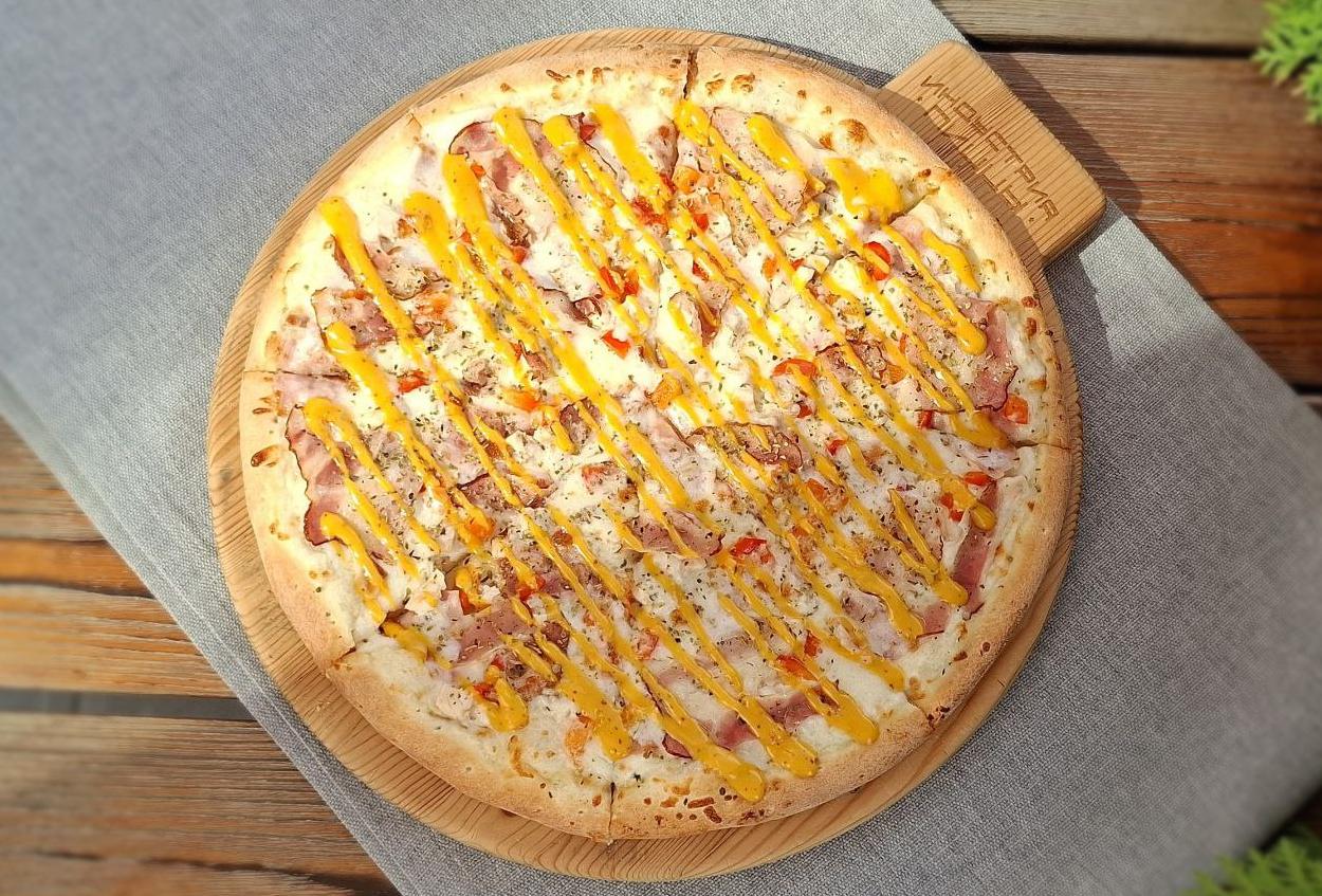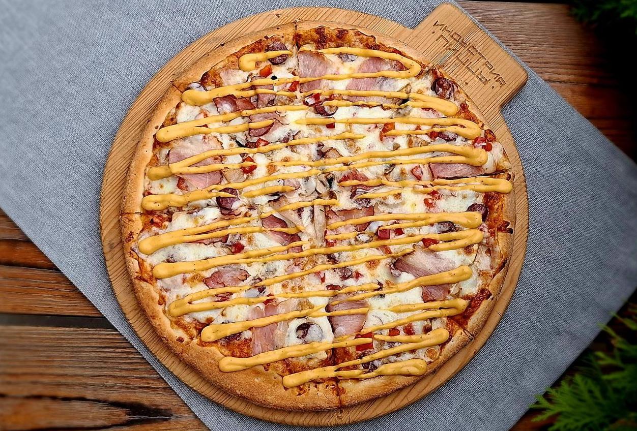 Состав: моцарелла, охотничьи колбаски, грибы, грудинка, болгарский перец, соус медово-горчичный.