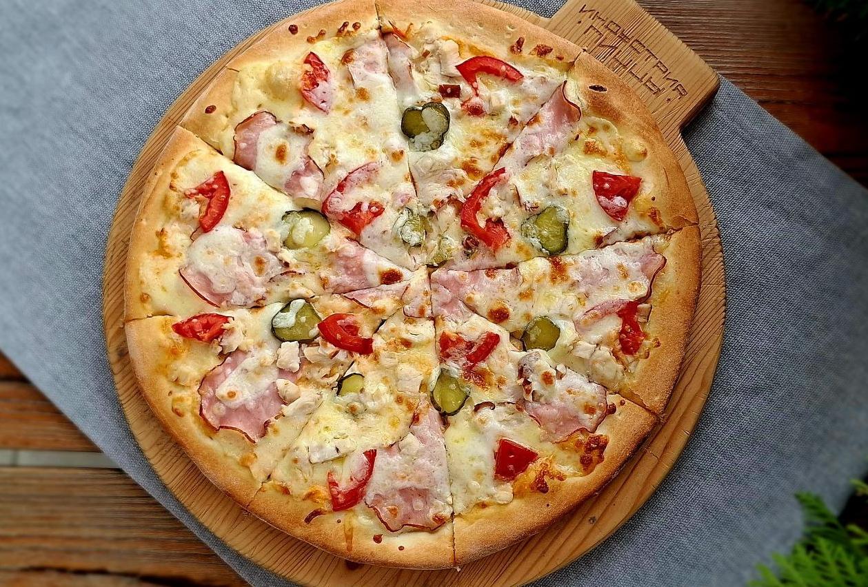 Состав: свиной окорок, копченая курочка, маринованные огурчики, томаты, моцарелла.