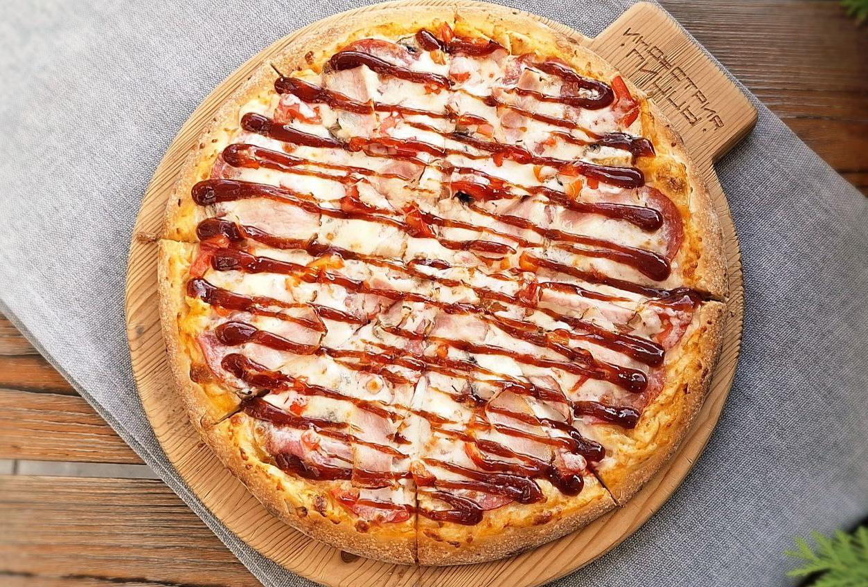 Состав: окорок, грудинка, сервелат, грибы, болгарский перец, томаты, соус барбекю.